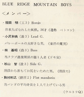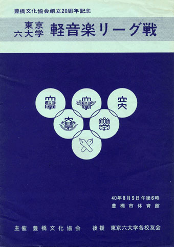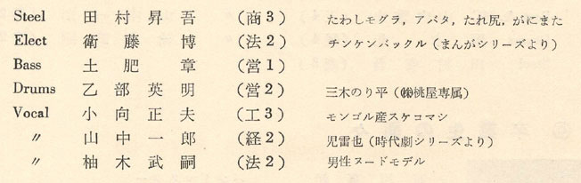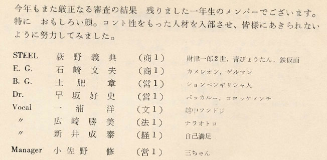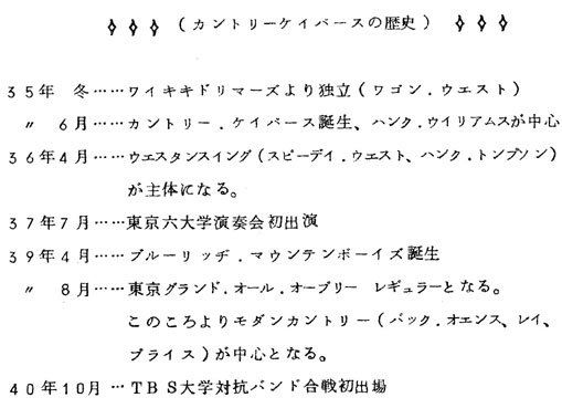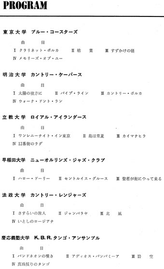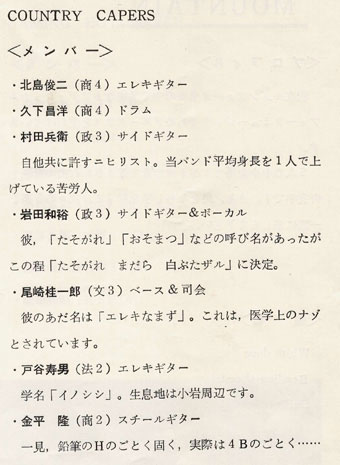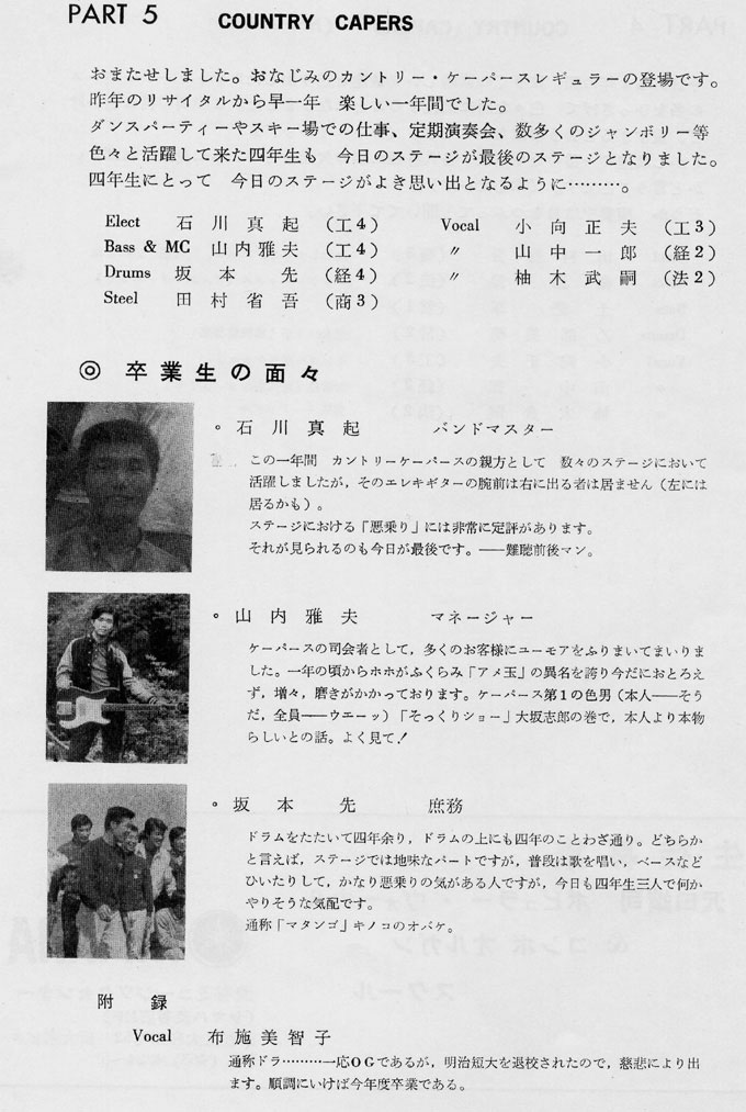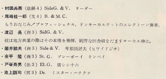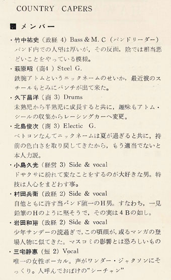 1964年、東京ヴィデオ・ホール楽屋にて、後列左から明大カントリーケイパースの斉藤真、久下昌洋、柴田信重、 ★この他の写真、ケイパース写真館はこちらに移りました 新生カントリーケイパース第一期メンバー 1962年6.24(日)軽音楽クラブ定期演奏会(神田共立講堂)プログラムより抜粋